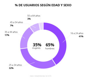 Dos tercios de los usuarios son hombres (65% hombres y 35% mujeres), aunque hace tan solo dos años la diferencia era mucho más acentuada (81% hombres y 19% mujeres). Por edades, no cabe duda de que Twitch es una plataforma de centennials (41%) y millennials (32%).